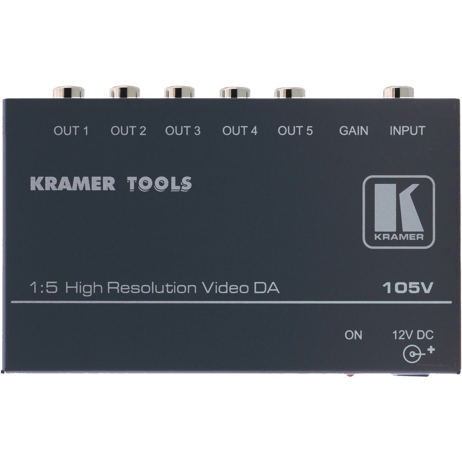 The Kramer 105V is a high-performance distribution amplifier for composite video signals. It takes one input, provides correct buffering and isolation and distributes the signal to five identical outputs.